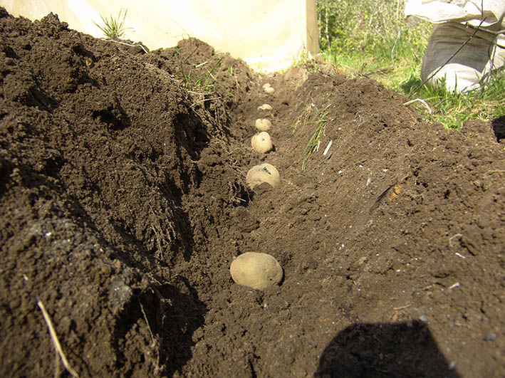 Выкопайте траншею в своей грядке глубиной примерно 4-6 дюймов; треугольные или стандартные мотыги подходят.Положите семенной материал в траншею глазками вверх на глубину 8–12 дюймов для стандартных сортов картофеля и 12–16 дюймов для мальков. Вы можете положить капельную ленту в траншею рядом с семенным картофелем, чтобы сберечь воду и гарантировать, что вся проливаемая вами вода попадет на урожай, а не на сорняки. Накройте семена (и капельную ленту, если используется) несколькими дюймами почвы и слегка утрамбуйте … и все готово!