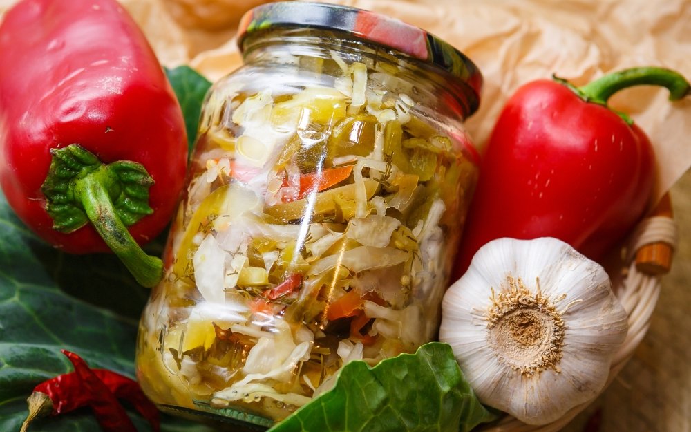 Маринованное ассорти из мелких огурцов, помидоров, лука, кабачков, цветной капусты, сельдерея, моркови и свеклы «Острые пикули»