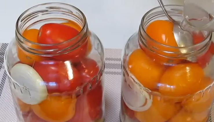 Подготовьте банки для консервирования.Все зеленые помидоры разрежьте пополам. Смешайте в кастрюле уксус, воду и соль и доведите до кипения.