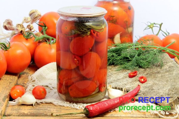 Предлагаем заготовить маринованные помидоры с острым перцем и чесноком, которые будут очень перечно-чесночными, кроме того, в маринаде ярко представлен укропный вкус.