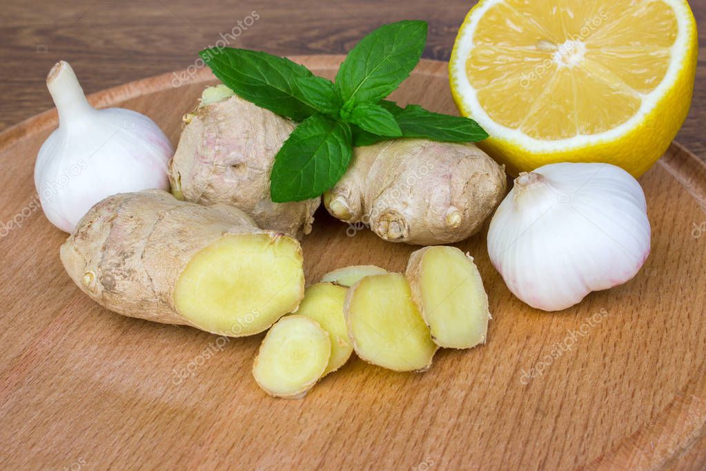 Лимон моем, обдаем кипятком. Чеснок очищаем от шелухи, а имбирь от кожицы.