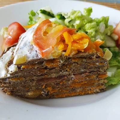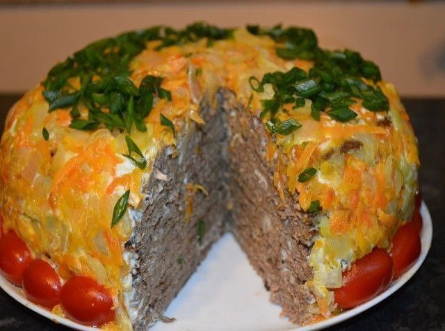 Печеночный торт из говяжьей печени с морковью, луком и чесноком