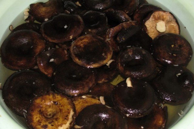 Грибы очищаются, моются и замачиваются в прохладной воде на 24 часа. Замачивание проводится для того, чтобы из грибов вышли вся горечь и вредные компоненты. После выдерживания в воде грибы варятся не меньше 20 минут на плите. Как только грибы остудились, к ним добавляют мелко порезанный чеснок, укроп и остальные ингредиенты. Всю массу следует плотно утрамбовать в емкость и поставить в холодное место. Именно там данная заготовка будет готова к употреблению через неделю, а перед подачей на стол важно не забыть добавить немного растительного масла. Отличная закуска подойдет к любому застолью, празднику и различным торжествам.