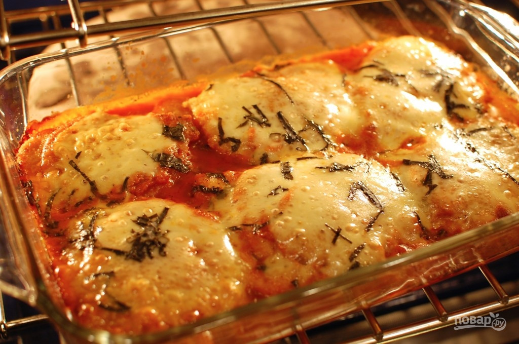 Твердый сыр натрите на мелкой терке и обильно посыпьте им куриные грудки. Поставьте противень с мясом в духовку, разогретую до 200 градусов, примерно на 30-35 минут. Точное время и температуру запекания определяйте по своей духовке. Готовое мясо извлеките из духовки и подавайте к столу в горячем виде. Приятного аппетита!