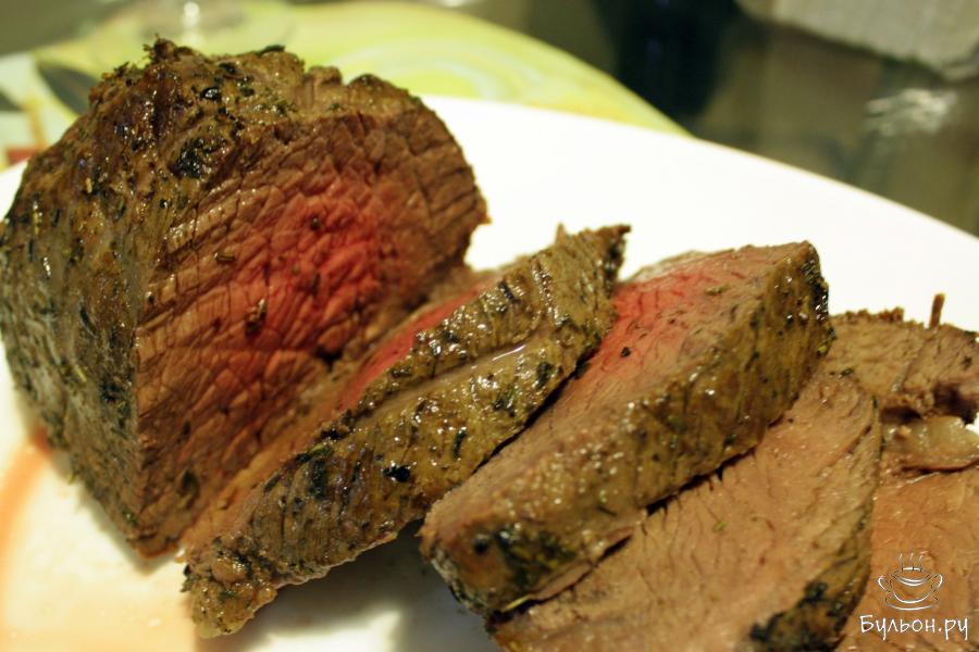 л. оливкового масла и солью. Ростбиф сначала обжарьте на оливковом масле со всех сторон. Затем смажьте получившейся смесью специй со всех сторон, оберните в фольгу, выложите на противень и запекайте 1 ч 40 мин в духовке. Затем фольгу снимите, температуру духовки повысьте до 230 С и запекайте мясо еще 7-10 мин, еще пока на нем не образуется румяная корочка. Выньте из духовки, переложите на блюдо, накройте фольгой и дайте отдохнуть мясу перед подачей 30 мин.