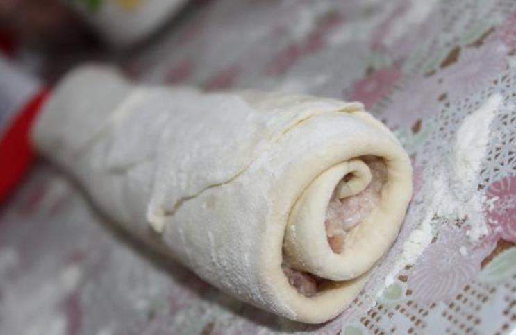 На тесто кладём фарш. Стараемся класть на середину немного разравнивая, не доходя до края.