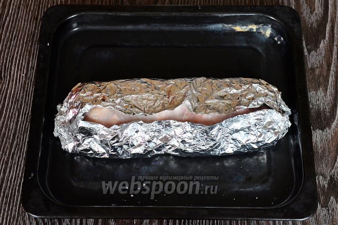 Рулет заверните в два слоя фольги (может вытекать сок), выложите в форму для запекания или противень. Запекайте рулет в предварительно разогретой до 190-200 градусов духовке около 40-45 минут. Ориентируйтесь на свою духовку.