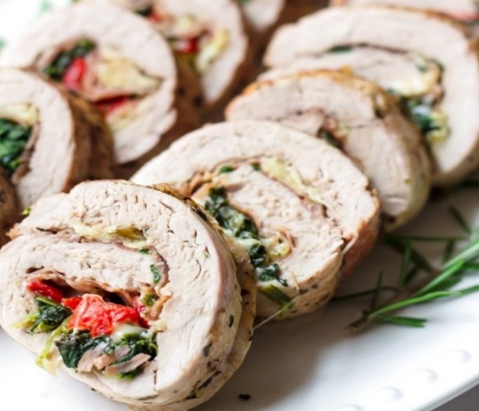 Филейную часть разделать острым ножом (или разрезать почти пополам). Во-вторых, заверните корейку в полиэтиленовую пленку и отбейте мясо плоской стороной молотка для мяса. Мясо должно быть толщиной около полусантиметра. - Выложите ингредиенты для начинки слоями: шпинат, жареный красный перец, приправу песто, бекон, сливочный сыр, соль и перец.