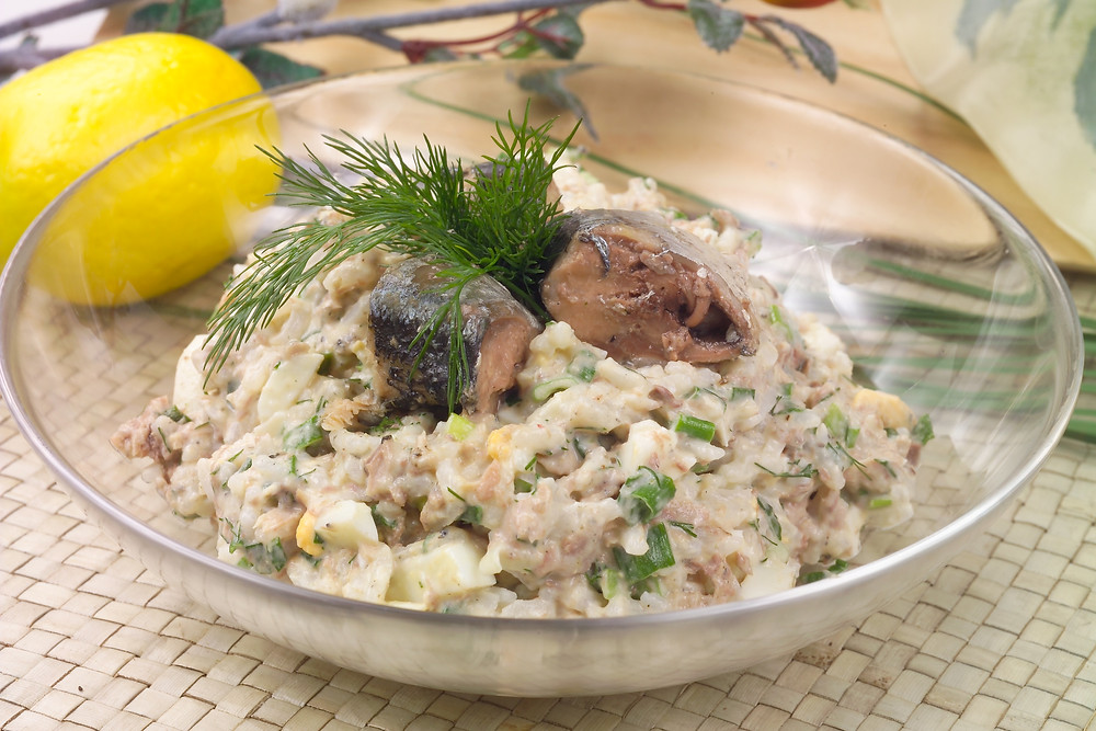 Морковь натереть на крупной тёрке и обжарить в растительном масле. На блюдо выкладывать слоями, промазывая майонезом: размятые рыбные консервы, обжаренную морковь, рис, измельчённые белки, верх засыпать желтками.