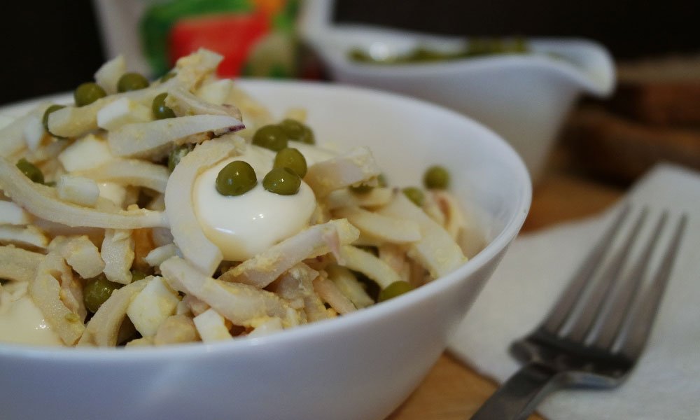 Самый вкусный рецепт салата с кальмарами, яйцом и зеленым горошком