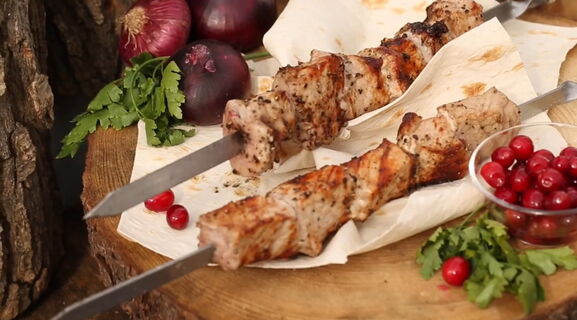 шашлык из окорока свинины подается с зеленью, луком, лавашом и фирменным соусом