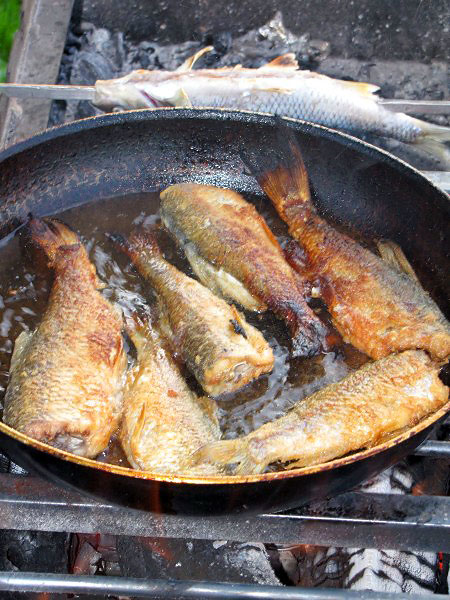 Речная рыба всегда (даже если их не видно) содержит яйца глист, поэтому ее жарить нужно до готовности, не спешить. Крупную речную рыбу лучше разрезать на кусочки, а мелкую порезать насечками по всей длине, чтобы хорошо прожарились мелкие косточки.