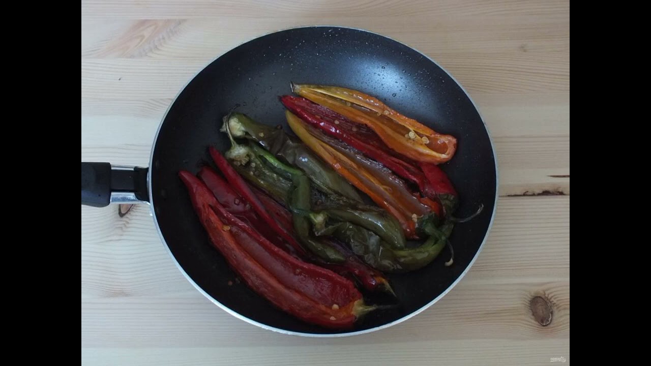 Разложите перцы на противне срезом вверх. Поместите кожицу на жаровню и запекайте в течение 30–35 минут, сморщив кожу и слегка покрыв ее пузырями. После того, как охлаждение закончилось, полностью снимите кожуру со сковороды.