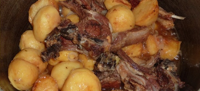 Сверху выложить мясо, смазать его горчицей и посыпать листьями розмарина (немного оставить). Накройте бекон влажной бумагой для выпечки. Плотно накройте горшок сложенной фольгой. Отправляем бекон в разогретую до 170 градусов духовку на четыре часа. Через два часа проверьте, если есть необходимость, подлейте немного воды. 3. Картофель отварить в подсоленной воде до полуготовности. Переложить в форму, добавить немного оливкового масла, посолить, поперчить и посыпать оставшимся розмарином. Все хорошо перемешать и поставить в духовку на час-полтора до готовности грудки.
