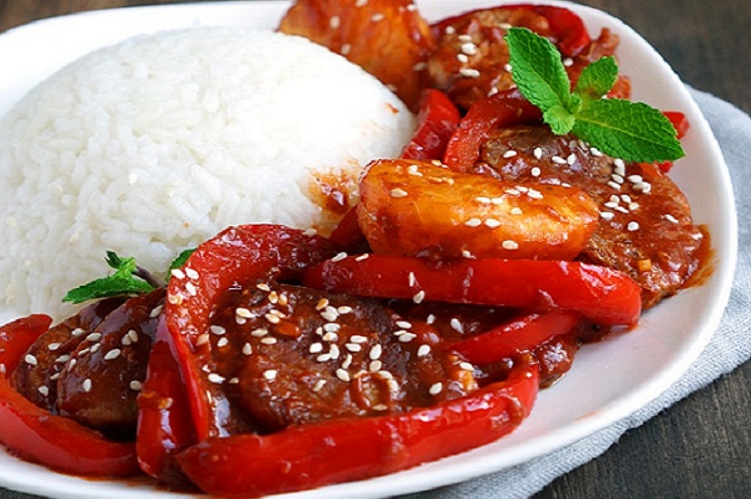 Тушеная свинина в сладком соевом соусе – Нежные кусочки свинины, тушеные в ароматном соусе с оттенком остроты.