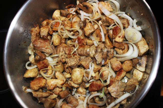 Добавьте к мясу грибы. Жарьте, периодически помешивая, до готовности мяса и грибов примерно 10 минут.