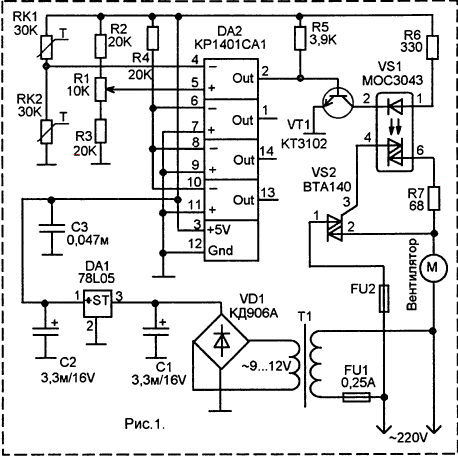 Электронная часть устройства, за исключением датчика, смонтирована на печатной плате из односторонне фольгированного стеклотекстолита размерами 70x70x2 мм и вместе с магнитным пускателем К2 размещена в пластмассовом корпусе подходящих размеров. Терморезистор-датчик сделан выносным и для большей чувствительности прикреплен к небольшому алюминиевому радиатору.