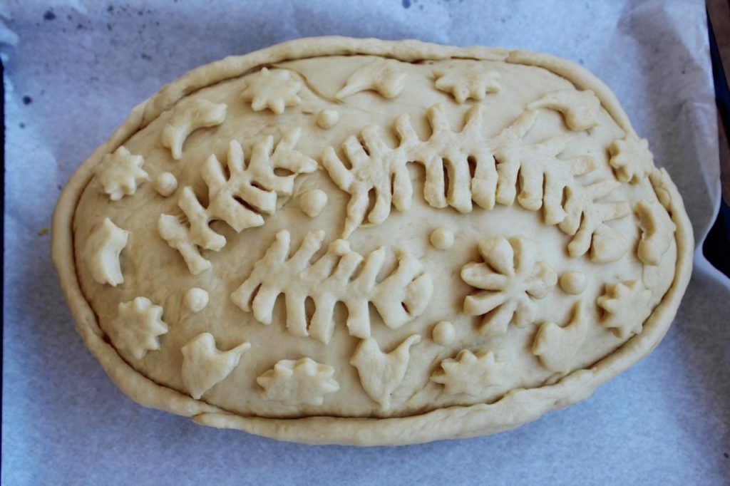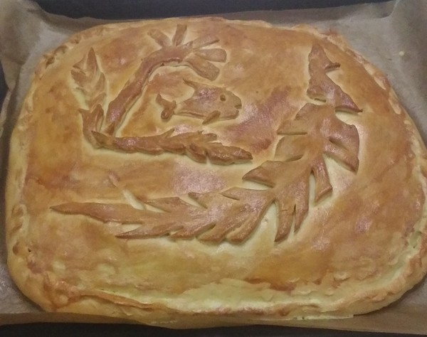 Один из них делает на несколько сантиметров меньше, чем другой. Распределяем начинку по центру меньшим пластом, края промазываем яйцом. Верх покрыт большим пластом, края тщательно скреплены друг с другом. Обрезаем лишние края, формируем их. Кулебяку смазать яйцом, украсить фигурками. Сделать несколько проколов вилкой и поставить в духовку. Выпекаем до румяной корочки. Смажьте готовый пирог маслом, оставьте остывать.