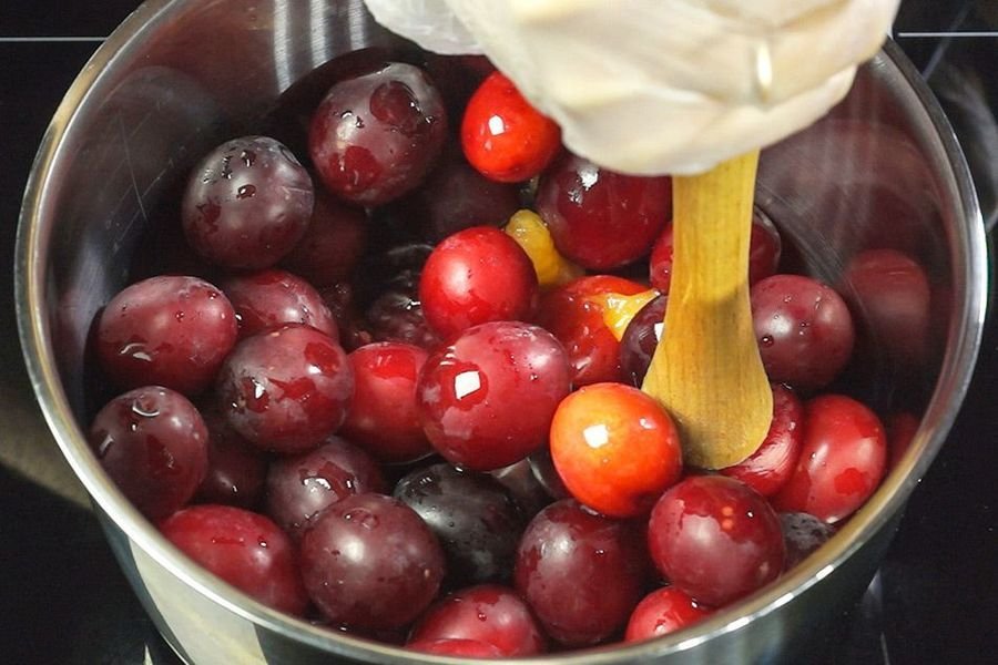 Алычу переберите, удалите хвостики, загрязнения и тщательно промойте в нескольких водах. Разломайте несколько плодов и проверьте на наличие червяков. Если они есть – переберите всю алычу, отберите чистые и удалите косточки. Если нет – варите целиком.