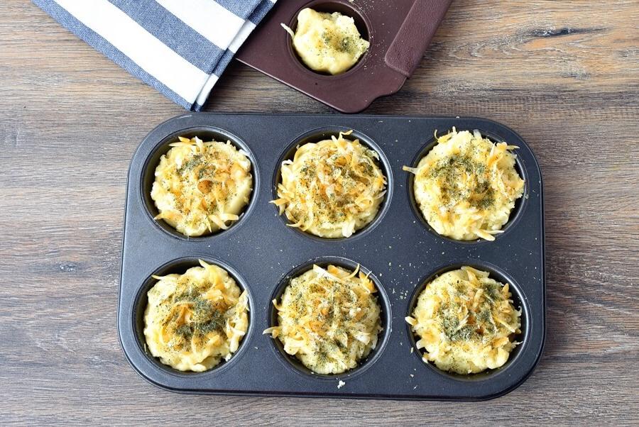 Добавьте оставшийся картофель в сковороду и посыпьте оставшимся сыром и крошками бекона.