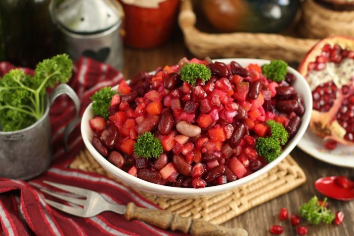 В этом рецепте кроме традиционной свеклы, картошки, моркови, соленых огурцов и квашеной капусты будет консервированная фасоль. Такой аппетитный винегрет с фасолью – салат на любой стол, но особенно хорош во время Поста!