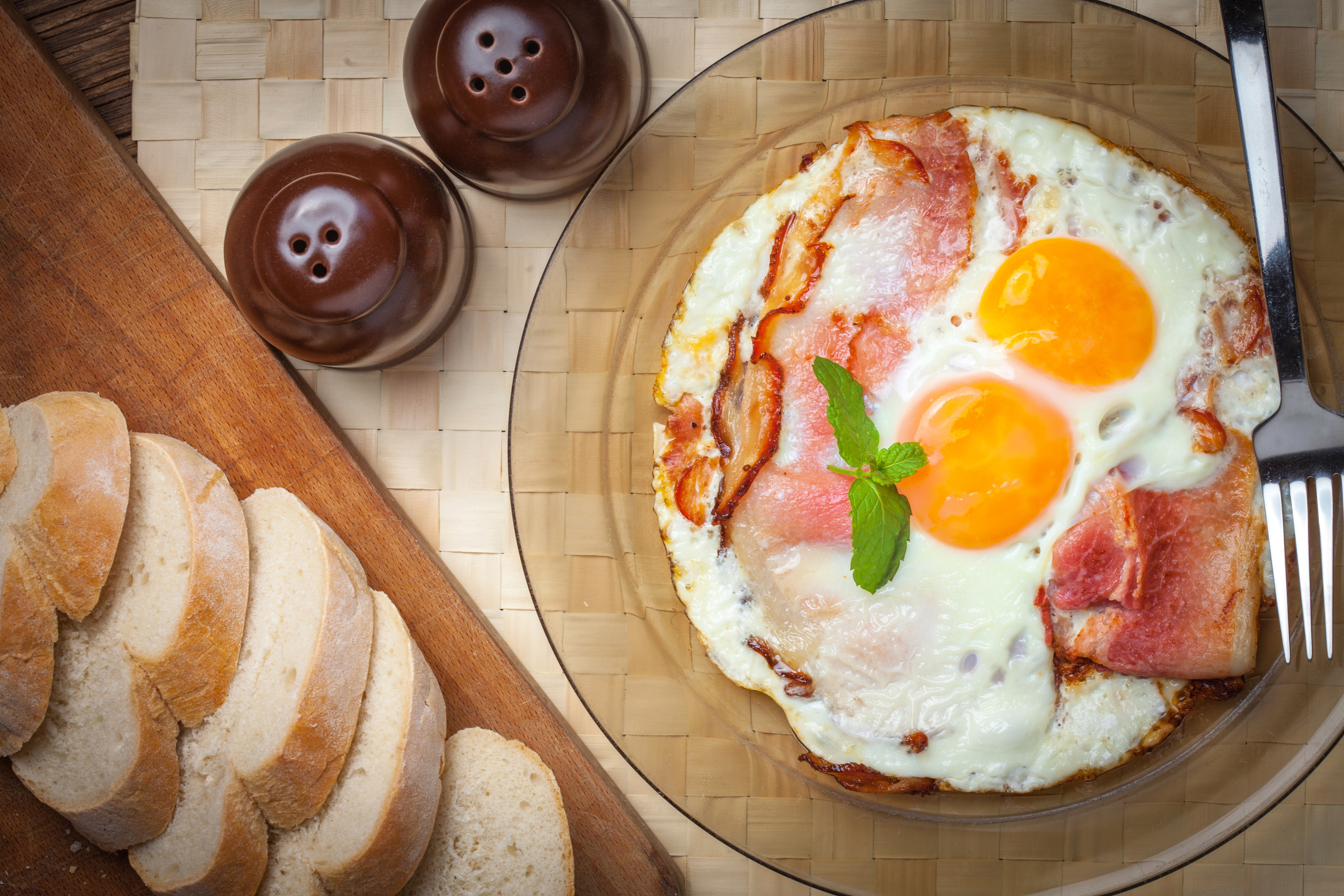 Выложите готовое блюдо на тарелку, сдобрите его солью и перцем. Будьте аккуратны — бекон уже хорошо соленый, не пересолите. Подавайте яичницу на стол. Приятного аппетита!