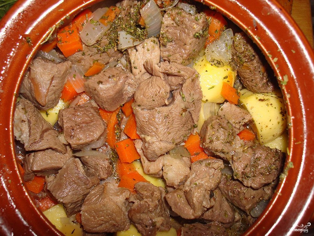 Спустя 10 – 15 минут, когда овощи с мясом пропитаются солью, выкладываем их в подготовленную форму, сначала картофель с луком, а сверху кусочки баранины.
