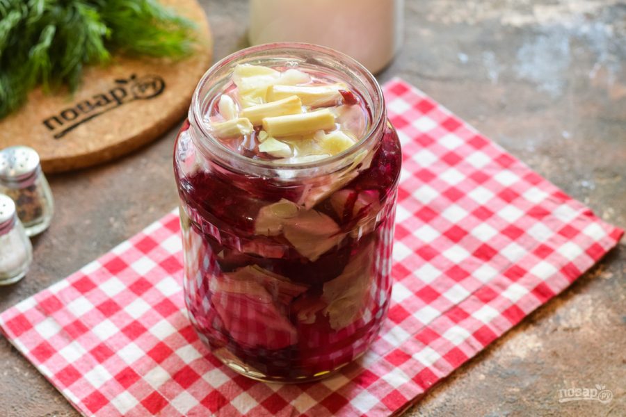 Капусту режут на крупные дольки, свеклу тонкими полосками, каждый зубок чеснока на 2 части. Затем капусту и свеклу слоями укладывают в емкость, добавляя чеснок. В кипящую воду добавляют соль, сахар и уксус, заливают емкость с овощами и ставят под гнет. При комнатной температуре выдерживают 3 дня, затем на холод для длительного хранения, но можно есть уже сразу.