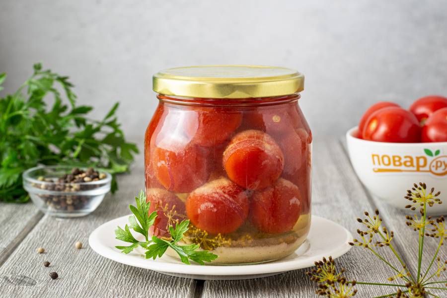 Дайте остыть маринаду и заливайте его в банку с помидорами. Закатайте стирилизованной крушкой и уберите храниться в темное прохладное место. Через неделю можно начинать употреблять закрутку.