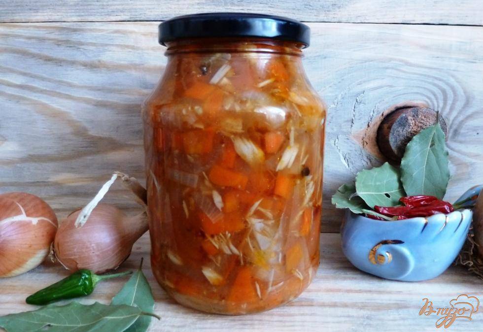 Во второй половине масла обжариваем на сковороде морковку с луком. Когда рыба с томатом протушится с полчаса, надо посолить, добавить сахар и выложить зажарку. Оставить тушиться ещё полчаса. В конце времени добавить уксус. Салат горячим расфасовываем по стерильным баночкам, закрываем под крышки и укутываем в тепло для медленного остывания.
