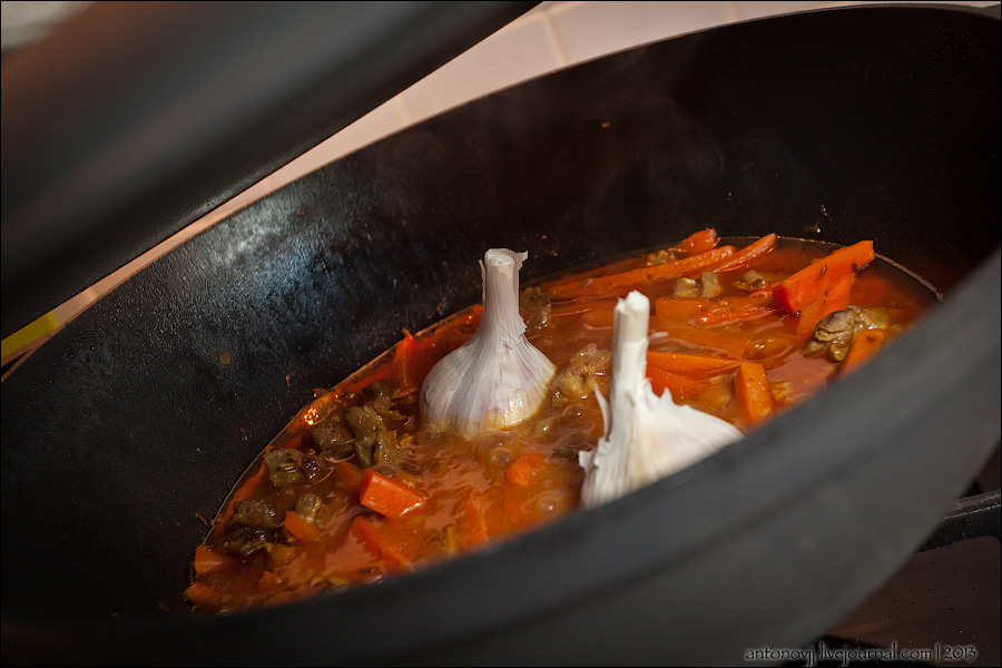 - Накройте кастрюлю крышкой и сделайте средний огонь. Тушить так называемый «зирвак» (мясо с овощами, специями и горячей водой) от 40 минут до 1,5 часов. Время зависит от качества мяса: тушенее мягче меньше, твердого – дольше.