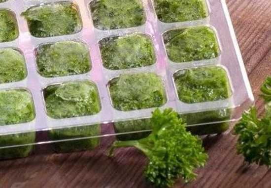 Заморозить зелень в кубиках. Для этого берем платформу для замораживания льда складываем в формочки мелко нарезанную зелень заливаем водой и готово.