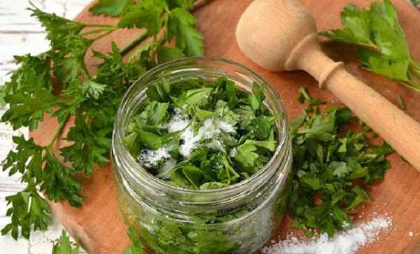 Для заготовки можно взять мелко натертые корнеплоды и измельченные стебли и листочки. Пропорции сырья к соли составляют 5 к одному. Например, на 500 грамм зелени берут 100 грамм соли. Ингредиенты смешиваются и закладываются в банки. Но не под горлышко, надо оставить место для сока, который будет образовывать со временем петрушка.