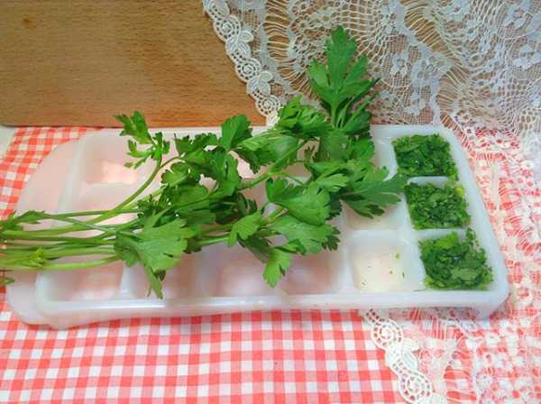 Затем нарезанная зелень закладывается в формочки для приготовления кубиков льда, заливается водой и замораживается в холодильнике. После заморозки кубики перекладываются в контейнер или пакет и хранятся в морозильной камере холодильника в таком виде. Ледяные кубики очень удобны для использования – их можно целиком бросать в готовящийся суп или рагу, где они быстро растают, освободив свежую зелень.