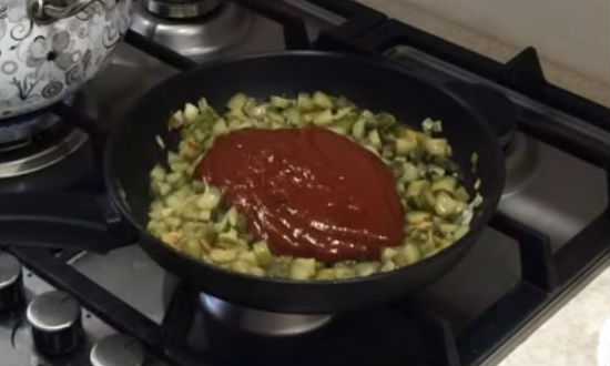 Кладем томатную пасту, размешиваем и, если необходимо, добавляем немного воды, жидкость должна только слегка покрывать огуречную массу, по мере выкипания, можно подливать воду.