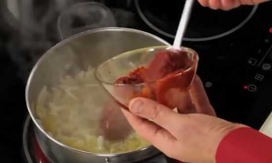 - Разогреваю сковородку и тушу лук без масла. Через 4-6 минут кладу аджику, пасту из помидоров, болгарский перец. После томления на медленном огне без растительного масла отправляю пассировку в бульон.