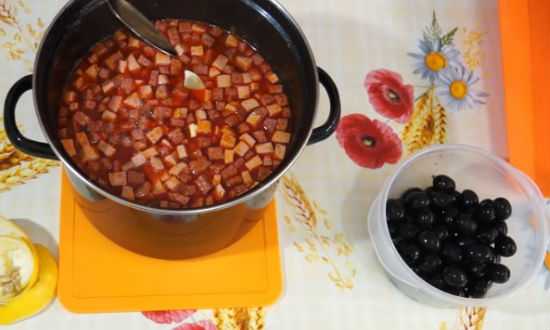 В самом конце добавляем каперсы, оливки. Пробуем на вкус, если не хватает остроты, добавляем в нашу мясную сборную солянку огуречный рассол и острый перчик. Также можно добавить рассол из-под оливок (маслин).