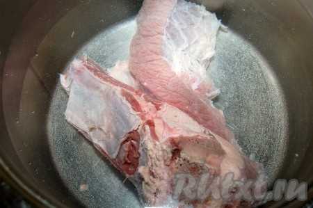 Кусок говядины, лучше всего грудинку и куриный окорочок хорошо промываем, кладем в кастрюлю и заливаем холодной водой.