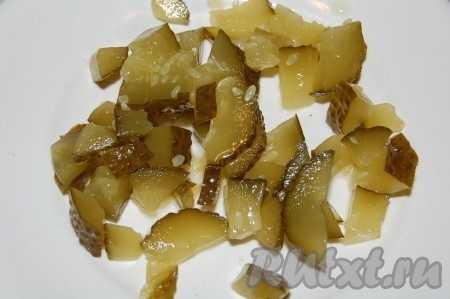 Соленые огурцы мелко нарезать и поставить варить в отдельной кастрюльке. Варить минут 20.