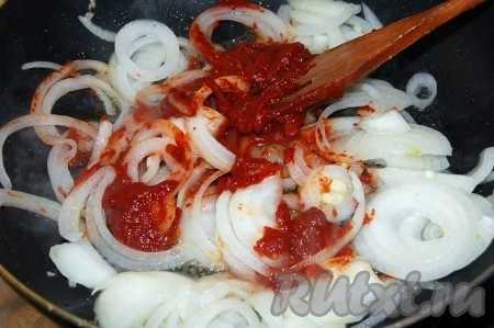 Репчатый лук мелко нарезать и обжарить с томатной пастой. Желательно томить долго, минимум пол часа, тогда цвет будет более насыщенный и яркий.