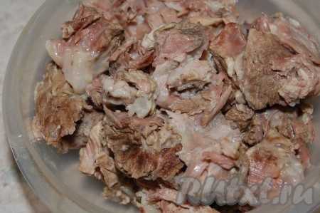 Когда мясо будет готово, достать его из кастрюли, разобрать и нарезать на мелкие кусочки.