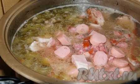 Мясо прокипело около 40 минут, оно почти готово, закладываем в кастрюлю буженину с колбасой и картошку и можно посолить