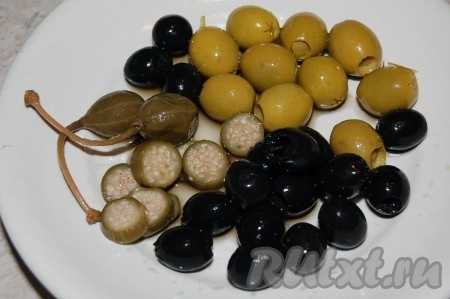 Теперь выкладываем мясной набор, маслины, каперсы с 1 – 2 столовыми ложками маринада от каперсов