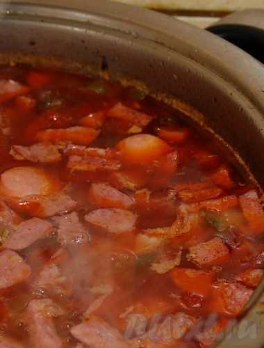 Полезный совет. В готовые колбасно-сосисочные наборы для солянки, которые продаются в магазинах, часто входят дешёвые и недорогие ингредиенты. Чтобы не испортить вкус супа, соберите ассорти из любимых колбасных изделий самостоятельно.