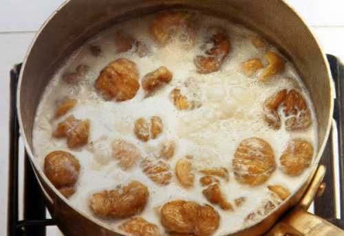 - Поставить емкость с молоком и каштанами на водяную баню и томить на медленном огне 30 минут, чтобы каштаны размягчились.