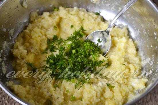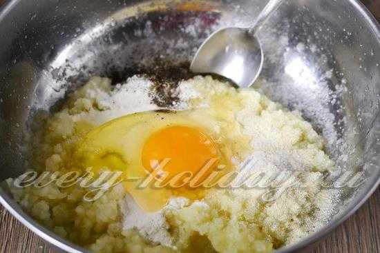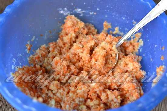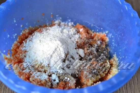 4. Когда фарш из овощей остынет, всыпьте в него просеянную муку, вбейте яйца, прибавьте немного соли, перца чёрного молотого и любимых приправ по своему вкусу. Вымесите всё хорошо. Пусть масса немного постоит, чтобы мука тщательно соединилась с овощами, и всё приобрело однородную консистенцию.