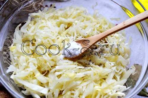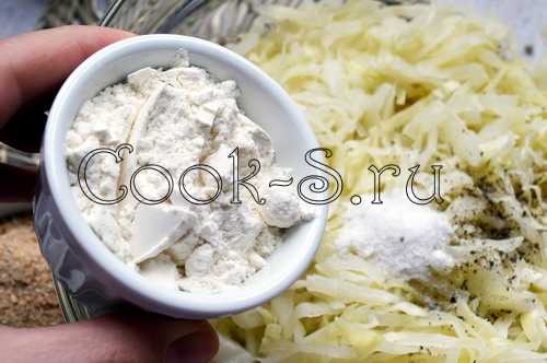 Затем добавить муку и руками перемешать капустный фарш. Капуста пустит сок, и все ингредиенты начнут взаимодействовать.