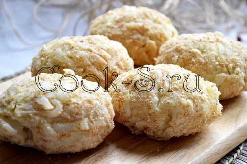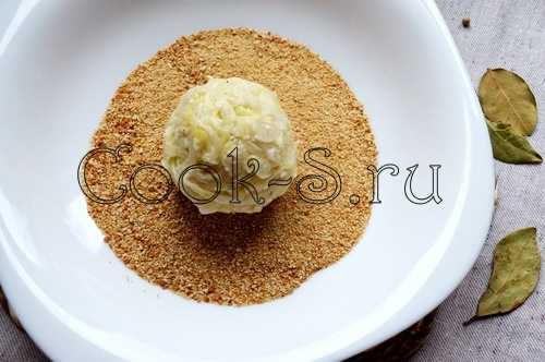 5. Руки намочите, слепите котлетки, присыпьте их сухарями панировочными. Нагрейте масло и жарьте в нём капустные котлетки.