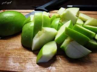 2. Подготовим овощи: режем лук полукольцами, перец – кубиками крупными, так же режем помидоры, яблоки полуломтиками (крупными).