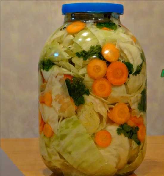 Капуста маринованная кусками с морковью в 3 литровой банке